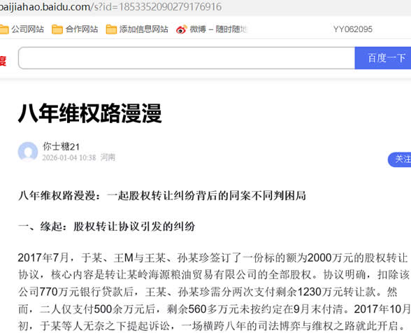 2017年7月,于某、王M与王某、孙某珍签订了一份标的额为2000万元的股权转让协议,核心内容是转让某岭海源粮油贸易有限公司的全部股权。协议明确,扣除该公司770万元银行贷款后,王某、孙某珍需分两次支付剩余1230万元转让款。然而,二人仅支付500余万元后,剩余560多万元未按约定在9月末付清。2017年10月初,于某等人无奈之下提起诉讼,一场横跨八年的司法博弈与维权之路就此开启。